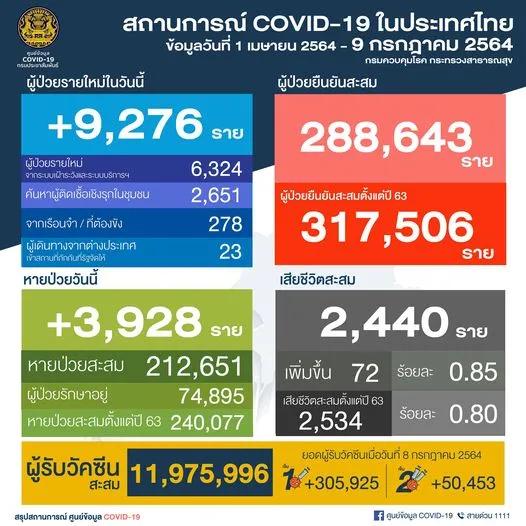 泰国新冠肺炎疾病单日新增病例数持续飙高,9日又增加9276例,逼近疫情通报史上最高纪录,全国累计达31万7506例。病故再添72人,总计2534死。