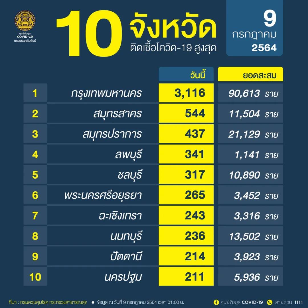 个别府治疫情,首都当天激增3116例,写下新高纪录,累计个案数一举突破9万例,来到9万613例。将当日新增病例数排名第2至10多之府治个案加总,都没有曼谷多。