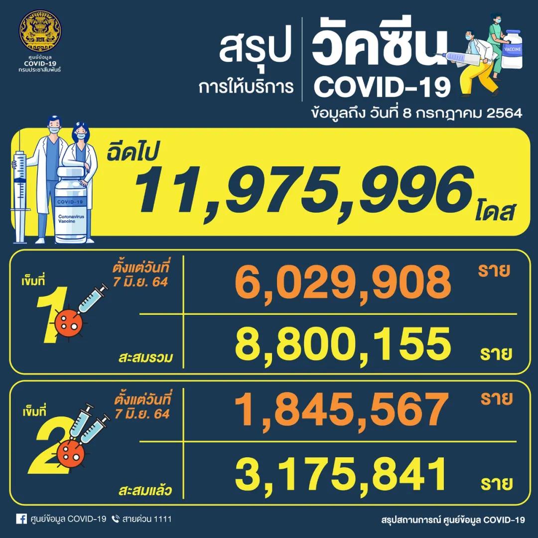泰国新冠肺炎疫苗接种统计,截至7月8日为止全国施打剂数为1197万5996剂,其中2针完整接种者有317万5841人。