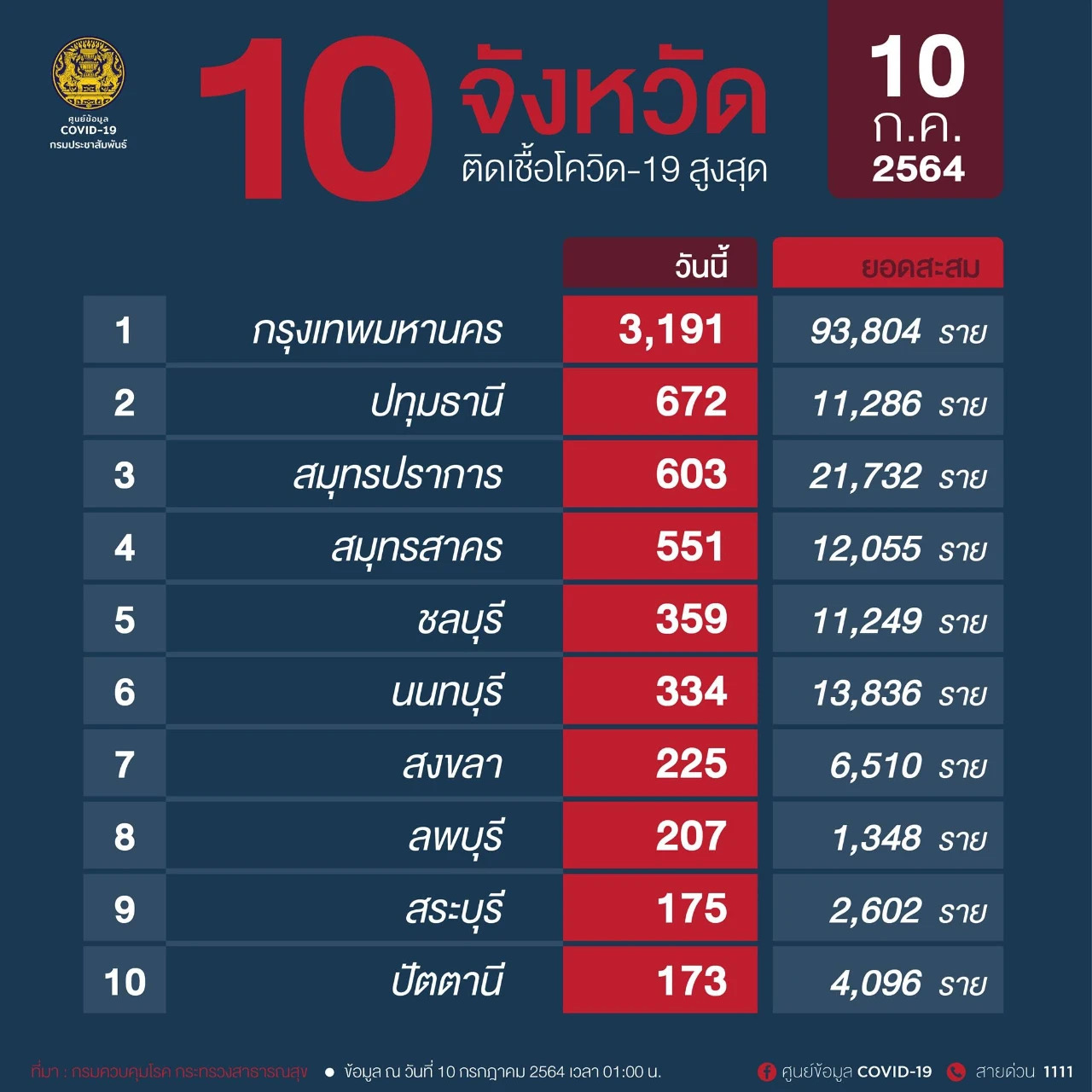 曼谷新增3191例,其次是巴吞他尼府672例、北榄603例、龙仔厝551例、春武里359例、暖武里334例和宋卡府225例。以上7府新增确诊病例全都增加。其中曼谷4月1日以来3个月时间内累计确诊9万3804人。