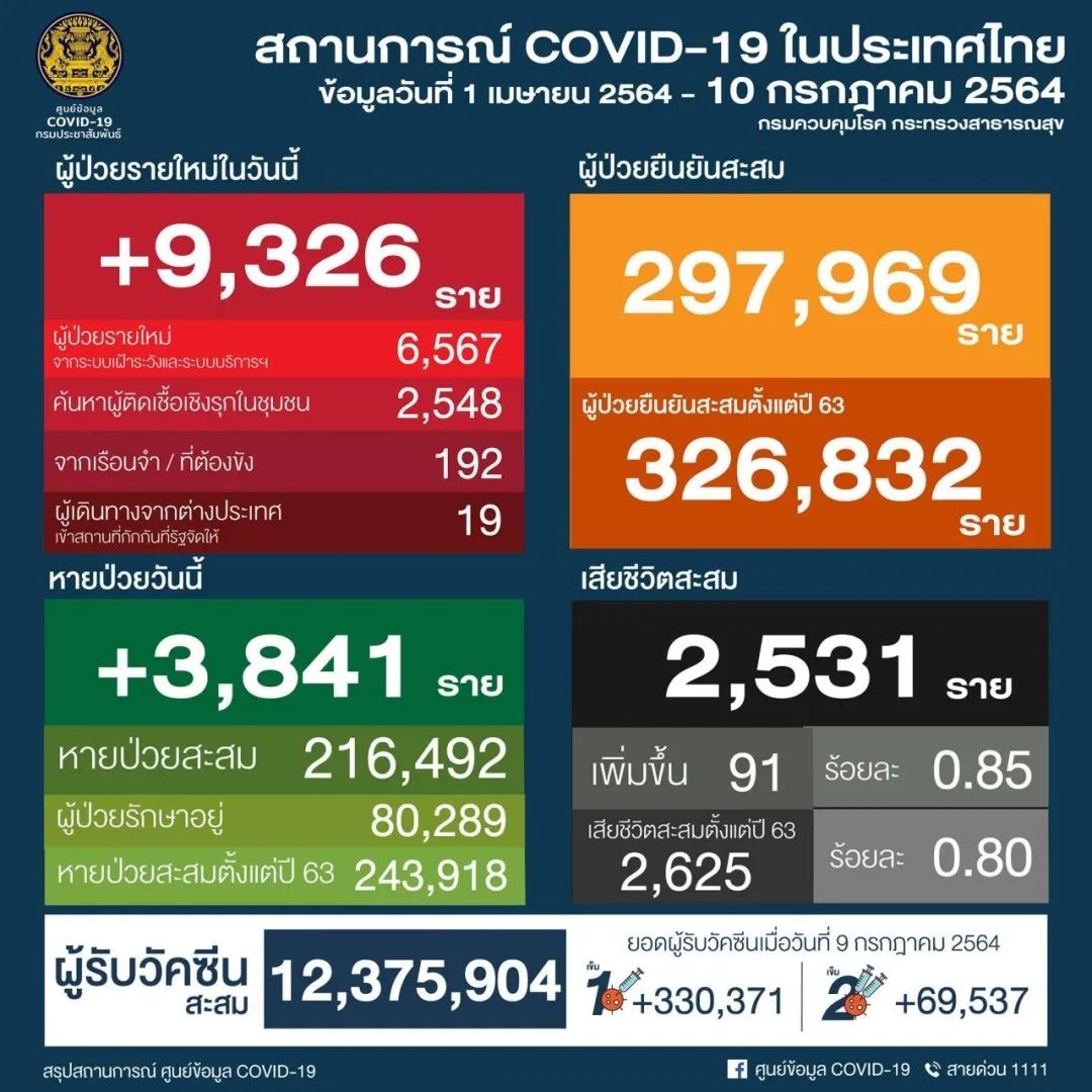泰国新冠肺炎疫情管理中心10日公布过去24小时全国新冠肺炎疫情大数据,单日新增9326人,病亡新增达91人,再创新纪录。