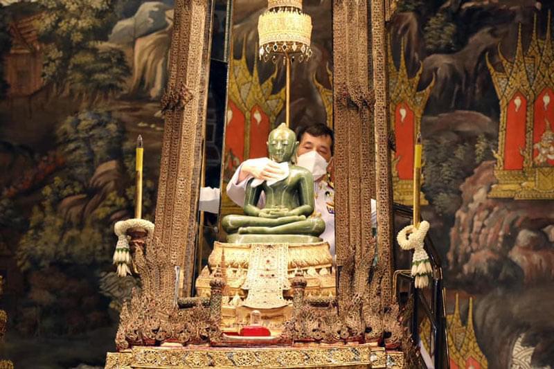 7月25日晚上19:00,泰国十世王玛哈•哇集拉隆功国王携素提达王后前往曼谷大皇宫玉佛寺,为玉佛脱下热季金衣换上了雨季金衣。据悉,泰国玉佛换装习俗一直从拉玛一世时期沿袭至今,每年泰国国王都会按照热季、雨季、冷季三季亲自为玉佛寺玉佛换装,以祈求风调雨顺国泰民安。