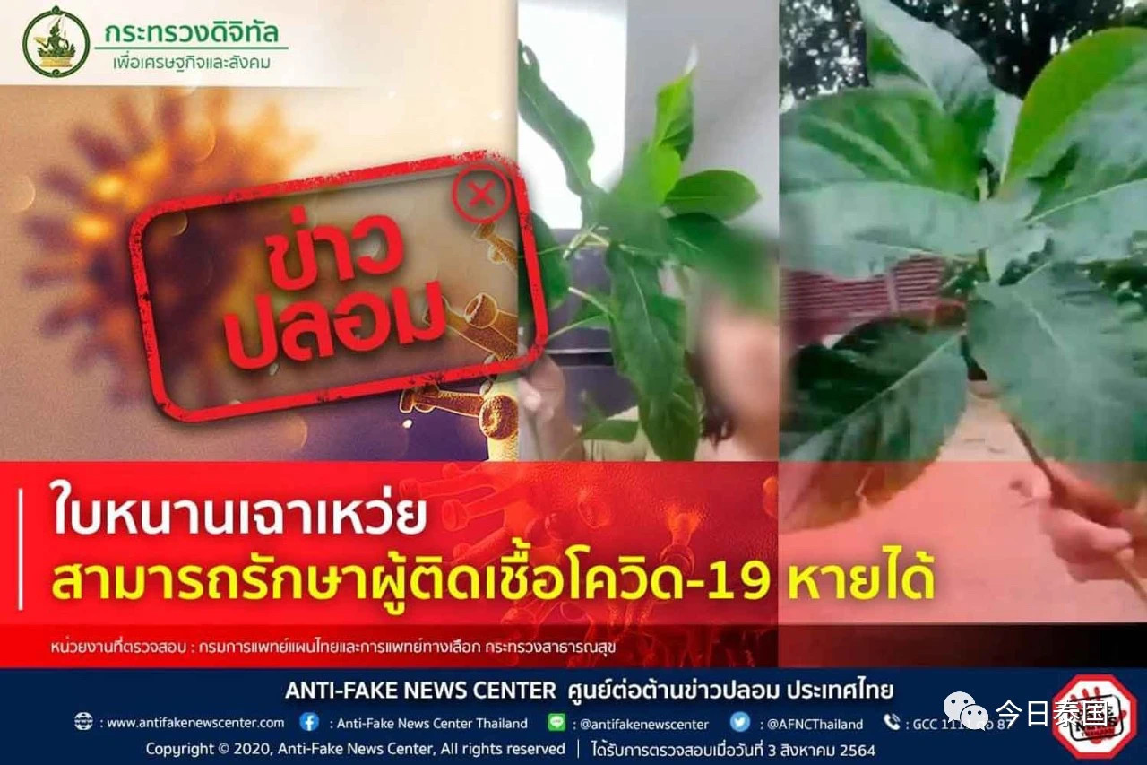 泰国皇家警察在最近公布,网络上流传的“苦叶”可以治疗新冠病毒感染为假消息,请民众切勿轻信和传播。