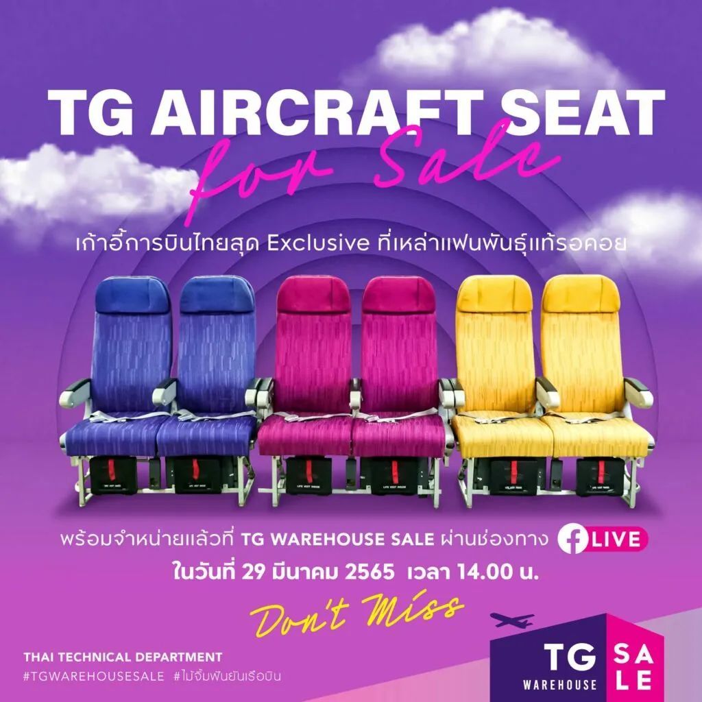 泰航「TG Warehouse Sale」脸书网页贴出一则广告,宣布29日下午2时起,透过线上直播方式推销泰航客机上的特色座椅,初步通报定价一对座椅3万5000铢,有蓝、红、黄3种颜色供选择,邀请泰航的粉丝们采购收藏,虽然近期难有机会上飞机旅行,在家中摆一对机上真正座椅,也能为航空迷带来心理慰藉。