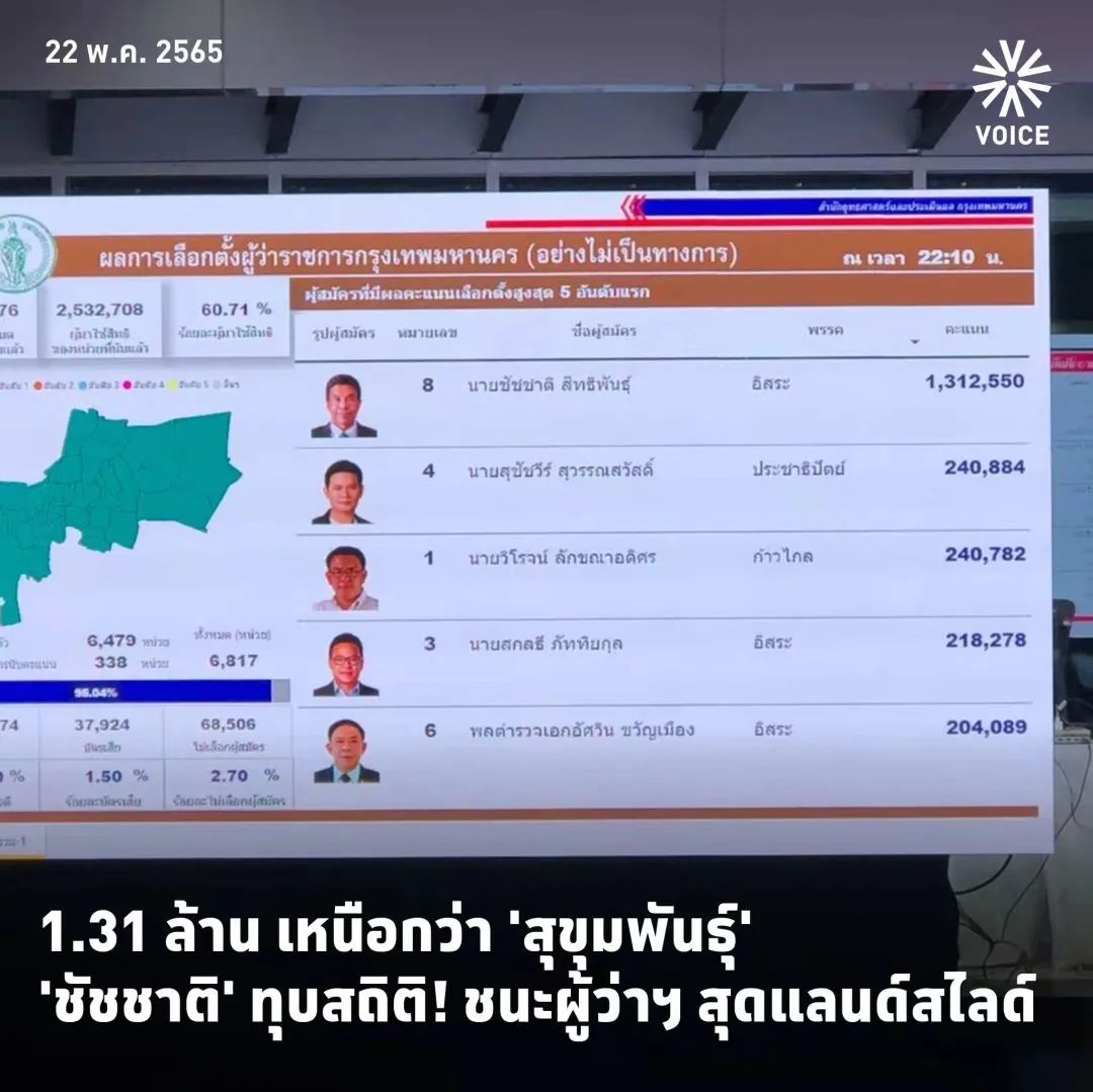 5月22日,是曼谷市和春武里府芭提雅市市长选举日。在曼谷市长大选中,查察的票数一直遥遥领先。截至发稿时统计95%的结果,查察已经获得超过131万选票,创造历史上曼谷市长选举所获票数最高的记录。素查威和威洛选票非常接近,都超过24万。一旦选举委员会承认选举结果,查察将成为下一任曼谷市长。