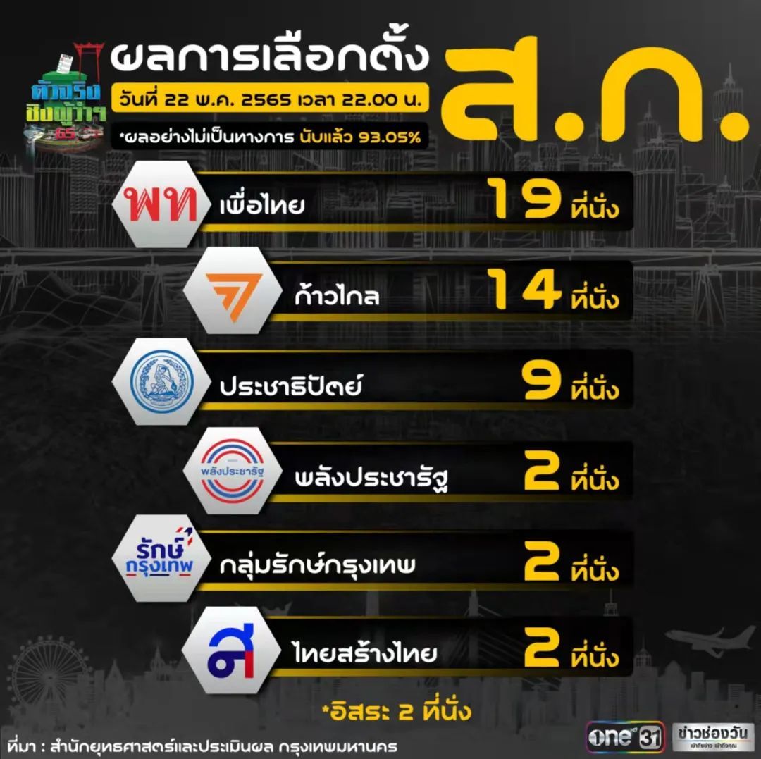 另外截至晚22点统计93.05%的结果显示,为泰党在曼谷议员选举中拔得头筹,获得19个席位。远进党位列第二,获得14席,民主党排列第三获得9席。