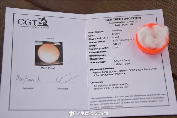 据男子表示,其在吃象牙凤螺时,咬到了不明物体,以为是店里没将螺内的石屑清洗干净,因此将螺肉吐出来后发现在螺肉内有一颗类似珍珠的物体。随后与女友谷歌发现,该物体正是十分罕见的美乐珍珠。因此,这对情侣将珍珠送至清莱科研中心进行检验,科研中心检验完并出具证书表明该珍珠为美乐珍珠。且据悉,该珍珠价值不低于100万泰铢。