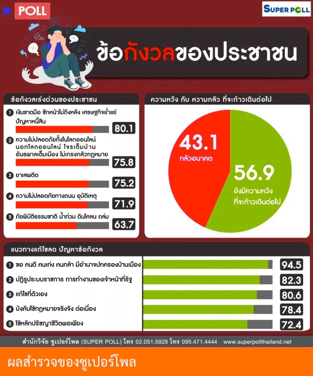 超级民意调查机构(SUPER POLL)主任诺帕端博士公布一项关于「民众担忧的事情」调查结果。在今年8月25-27日期间对全国各行各业的1145个样本进行定量研究(Quantitative Research)和定性研究(Qualitative Research)发现: