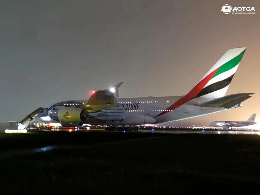 泰国机场公司(AOT)晒出最新照片,「阿联航」的一架空巴A380巨无霸客机,竟意外降落在曼谷廊曼机场。