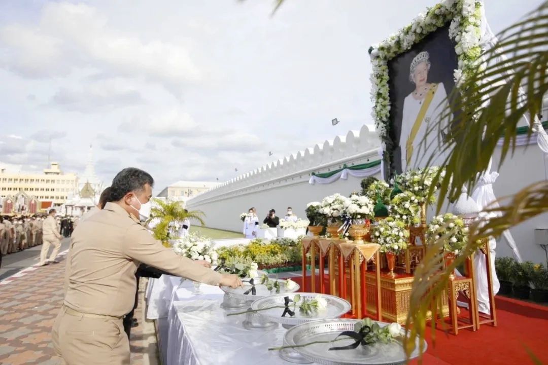 泰国第十世王陛下谕令,本月19至25日期间在曼谷大皇宫玉佛寺北侧围墙外设吊唁处,让各部门及民众参与吊唁英国女王伊丽莎白二世,诸位王室成员已于19日分别献上花圈,此间民众可前往献花致哀。