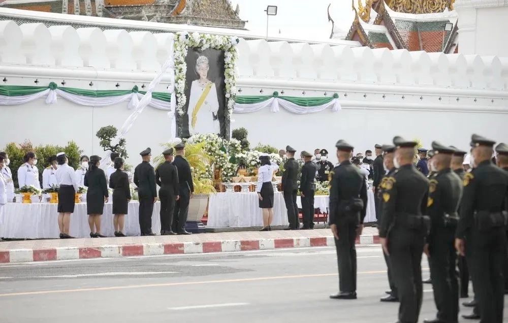 宫务处本月19日下午4时,在曼谷大皇宫玉佛寺北侧外墙正式设立灵台和英国女王伊丽莎白二世的巨幅照片,按照泰国的传统礼节吊唁英国女王。