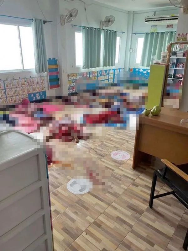 泰国东北部农磨兰普府那格朗县一所幼童托儿所今天下午约1点发生血腥大规模枪击案,一名前警官闯入儿童日托中心开火射击,目前至少36人丧生,12人受伤,死者包括成人和小孩,犯案动机还不清楚。有目击者看到枪手驾驶一辆曼谷车牌的白色丰田汽车,然后失去踪影。不过,最新消息指出,枪手已自尽。警方指出,枪手为涉及毒品被开除的34岁前警官班亚,袭击动机尚不清楚,初步猜测是为了报复被开除而作案。警方发言人指凶手枪伤及刺伤多人,死伤者多数为小孩。