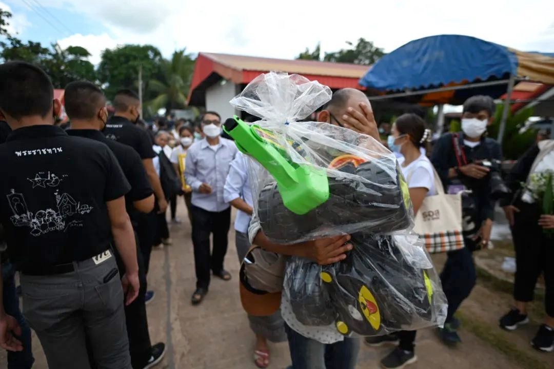 招魂仪式结束后,工作人员将死者在托儿所内的物品全部打包好,然后归还给死者家属,包括书包、鞋子等,打包的黑色袋子上贴有死者的名字,家属接到袋子的时候不断抹眼泪。