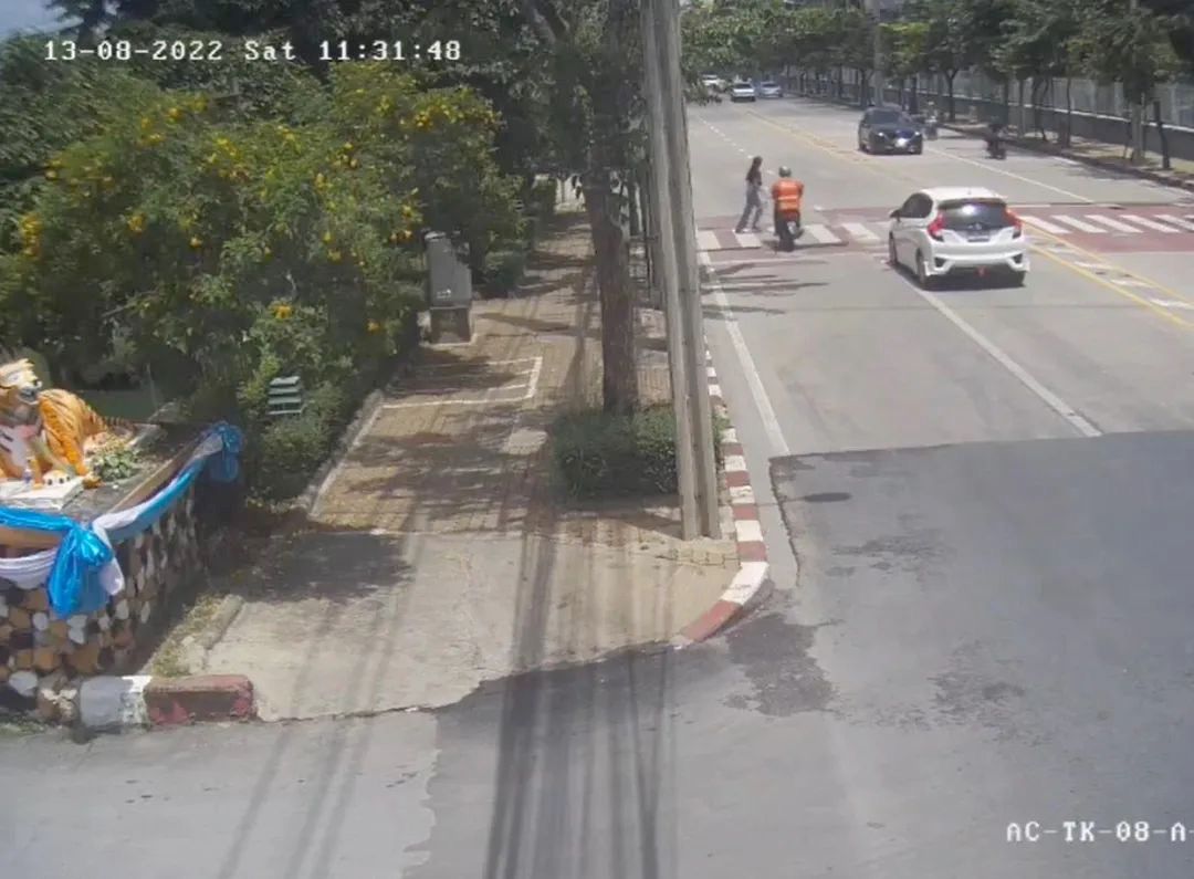 根据博主贴文了解到,事件发生于8月13日,地点位于曼谷通坤区,被撞的是正在吞武里国王科技大学就读大二的妮帕达(20岁),当时她正在穿越大学旁边的斑马线路,没想到被一辆从左车道来的摩托车猛烈撞击,飞出了好几米远,重伤躺在人行道上。肇事司机是29岁的蓬帕,他是一名外卖小哥。