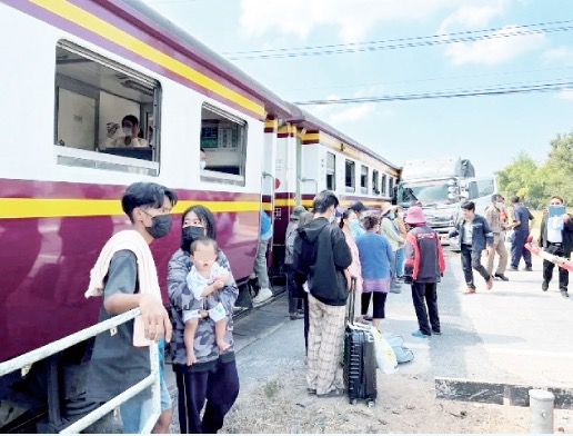 一列从曼谷开往清迈的火车途经喃奔府湄他县时,在铁轨和道路交汇的地方撞上一辆18轮卡车,火车上250名乘客惊吓不已,幸运的是只有一人受了点轻伤。
