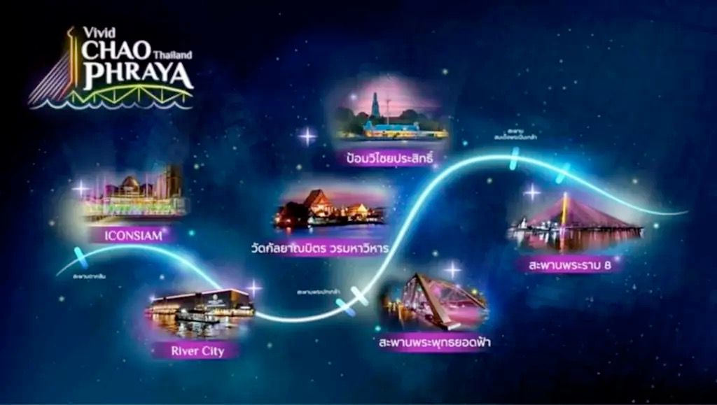 甘拉亚纳密佛寺,将在每晚展示3轮表演,分别是晚上7时30分、8时30分和9时30分,而且将在12、13、17、18、19、26和27号演出,以介绍湄南河与泰国的传统习俗文化无与伦比,广迎天下游客。一世王桥将在每晚展示6轮表演,分别是晚上7时15分、7时45分、8时15分、8时45 、9时15分和9时45分。曼谷河上城市将在每晚展示6轮表演,分别是晚上7时15分、7时45分、8时15分、8时45 、9时15分和9时45分演出。最后一个地点为「暹罗天地」(ICON SIAM),将在每晚展示4轮表演,分别是晚上6时15分、7时15分、8时15分和9时15分。