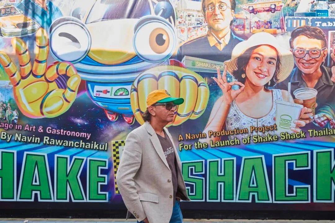 这幅被放在泰国首间门市前的大型图板,被Shake Shack描述为「艺术和美食之旅」。如果仔细观察,会发现画作中除了纳温个人肖像,另包括Shake Shack创办人丹尼•梅尔(Danny Meyer)、执行长兰迪•格鲁迪(Randy Garutti)也都被画入其中。